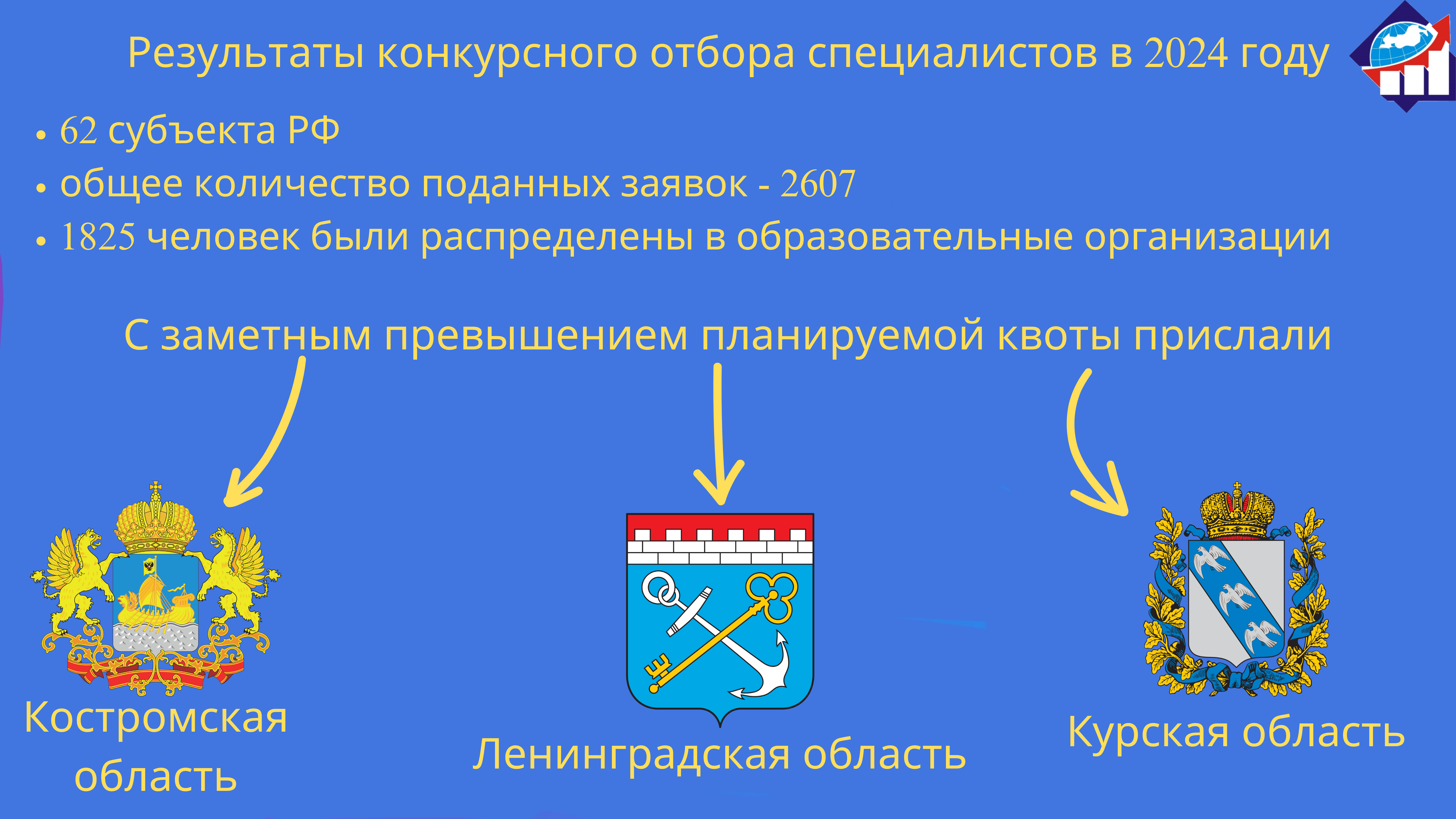 С заметным превышением планируемой квоты личные дела специалистов прислали следующие регионы: Курская область – перевыполнение квоты на 110%, Костромская область – перевыполнение квоты на 90%, Ленинградская область – перевыполнение квоты на 74%.